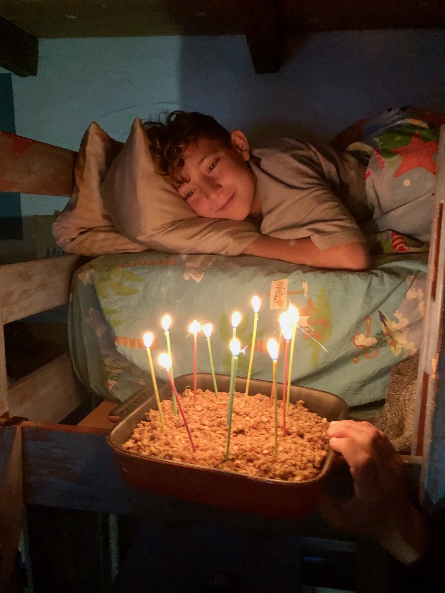 Our family ritual is the birthday person is woken up by birthday cake, candles and singing.